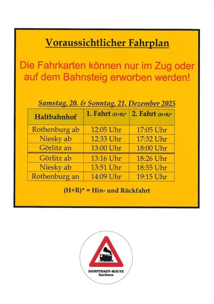 Die Sonderzüge zum Weihnachtsdampf fahren mehrmals täglich vom Bahnhof Rothenburg/O.L. über die winterlich geschmückte Strecke und wieder zurück.